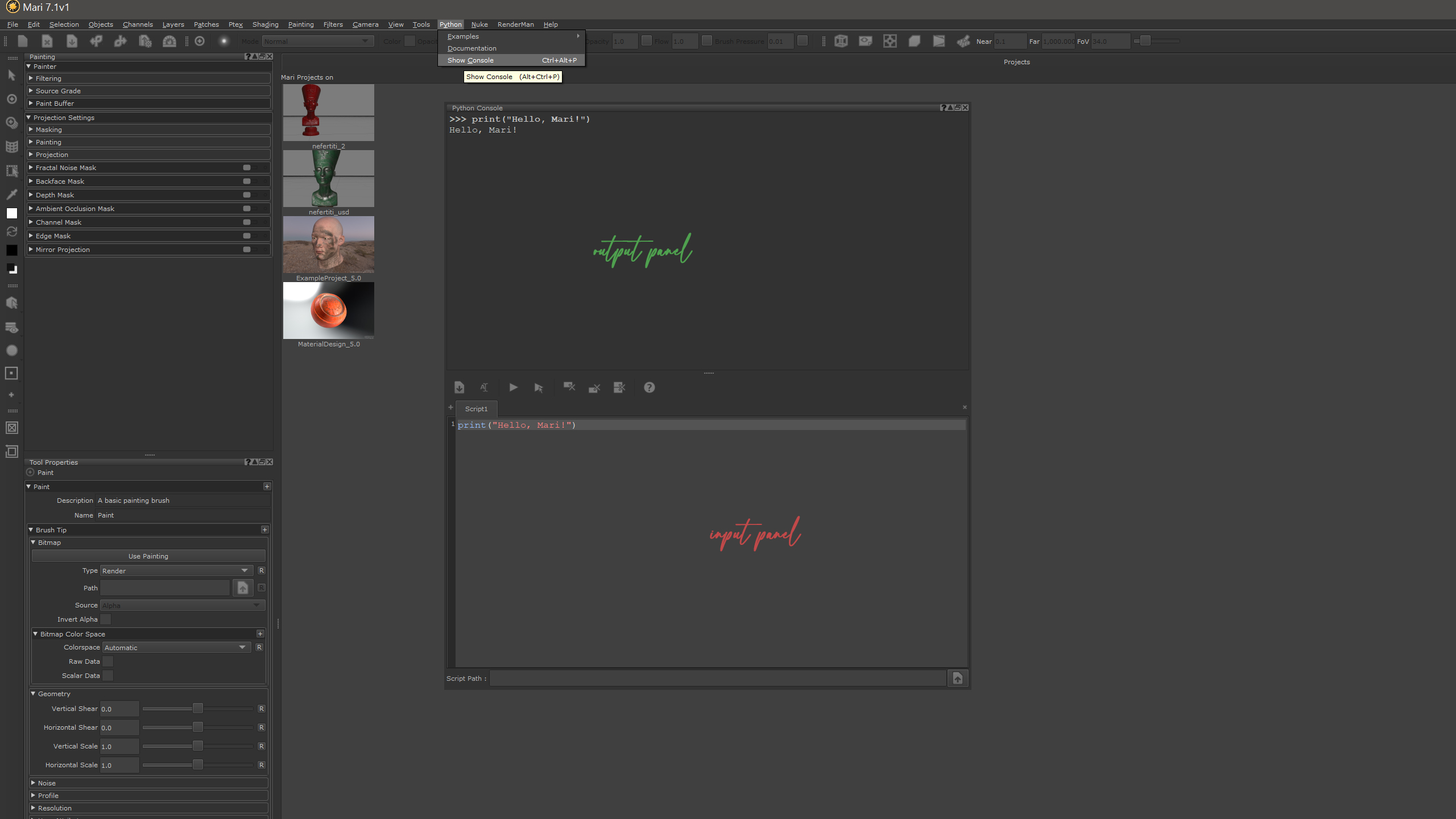 Before automating anything, I wanted to confirm I could trigger actions in Mari via Python. The simplest (and most obvious) way is through the Python Console: