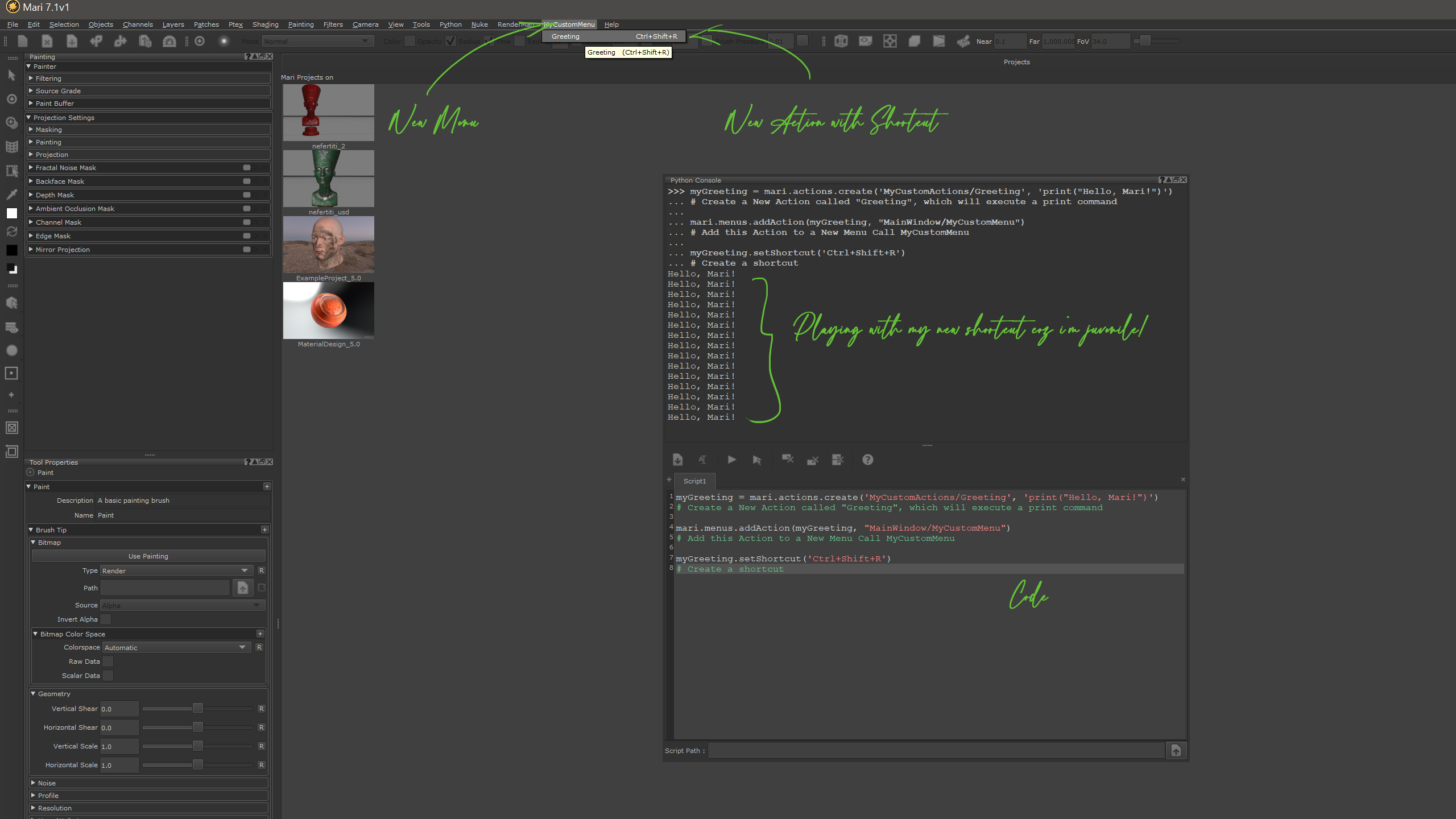 Once this is set up, you can trigger your new action with the shortcut, see the result in the console, and start building more complex scripts knowing Mari can recognize your commands.