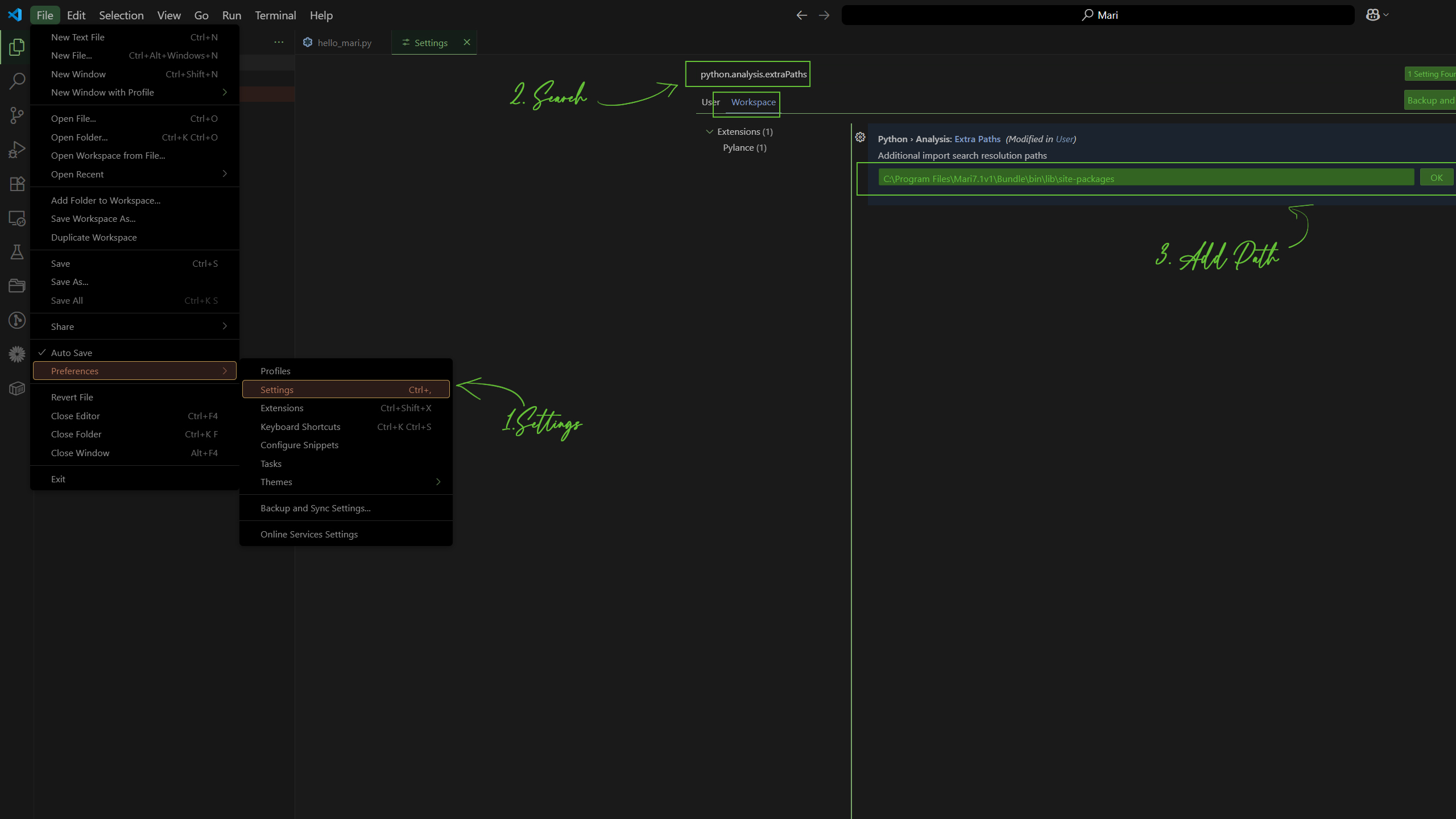 Add Itembutton and paste the path to Mari’s Python API and clickOK - Restart VS Code
