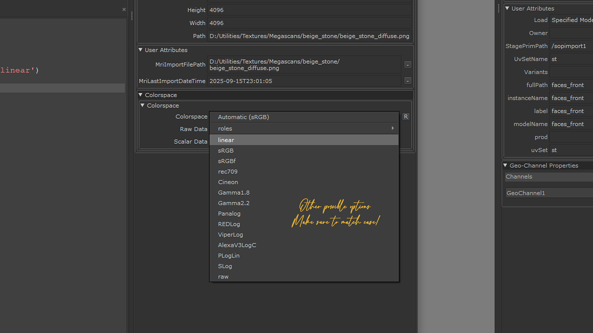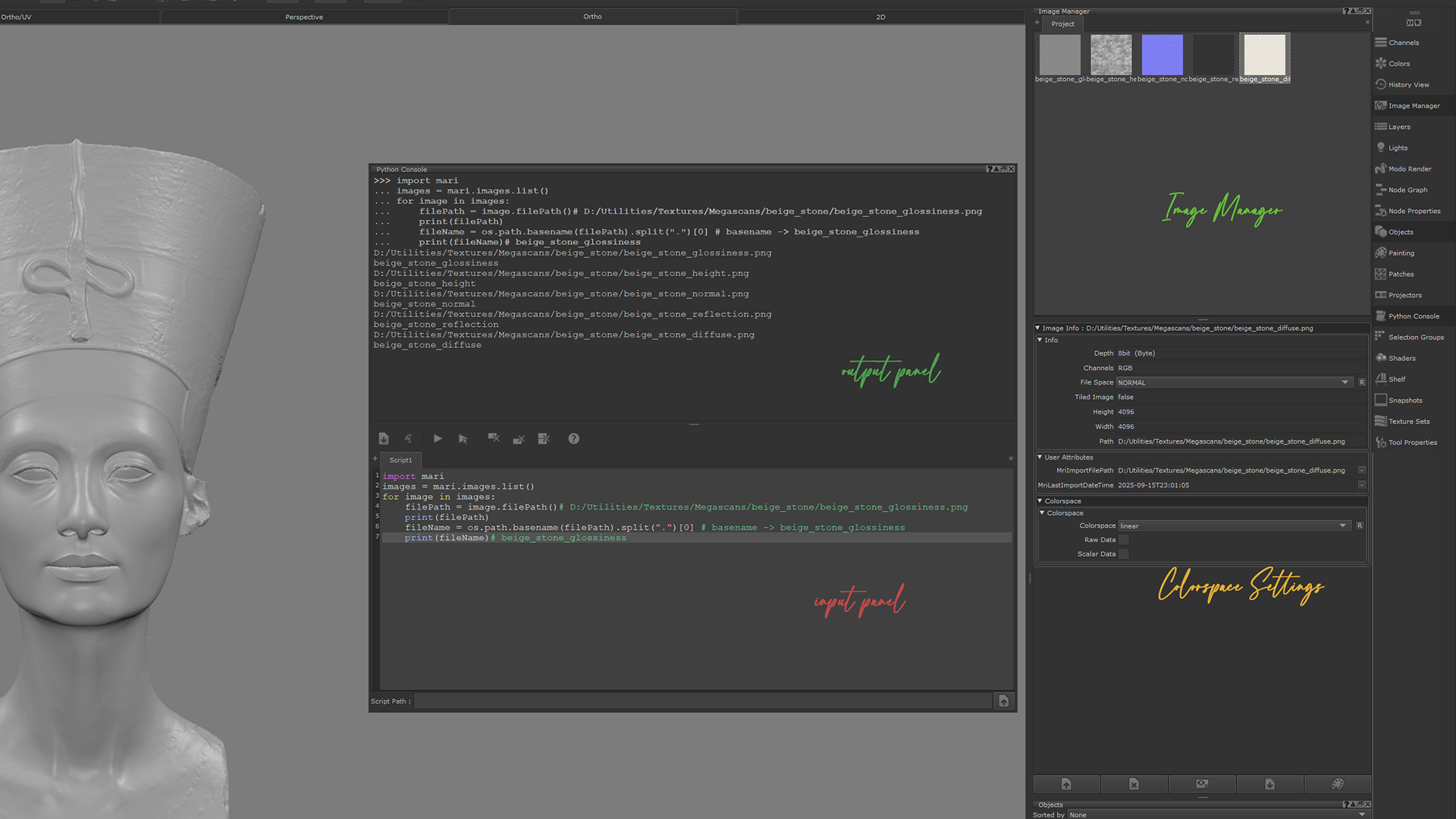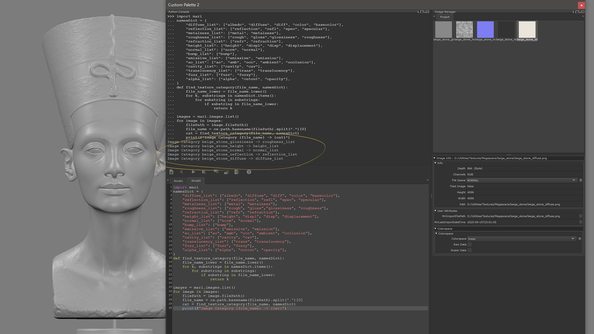 Now that I can detect new images as they land in Mari, the next natural step was to actually do something useful with them. My original goal was to have Mari automatically categorize and assign the right colorspace depending on the texture type — so I wouldn’t have to manually flip through menus every single time.